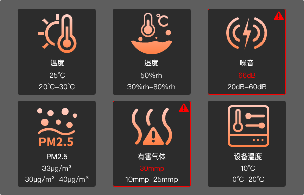 基于高精度传感器模组,实现温度、湿度、噪音、PM2.5、有害气体浓度等环境数据监测。