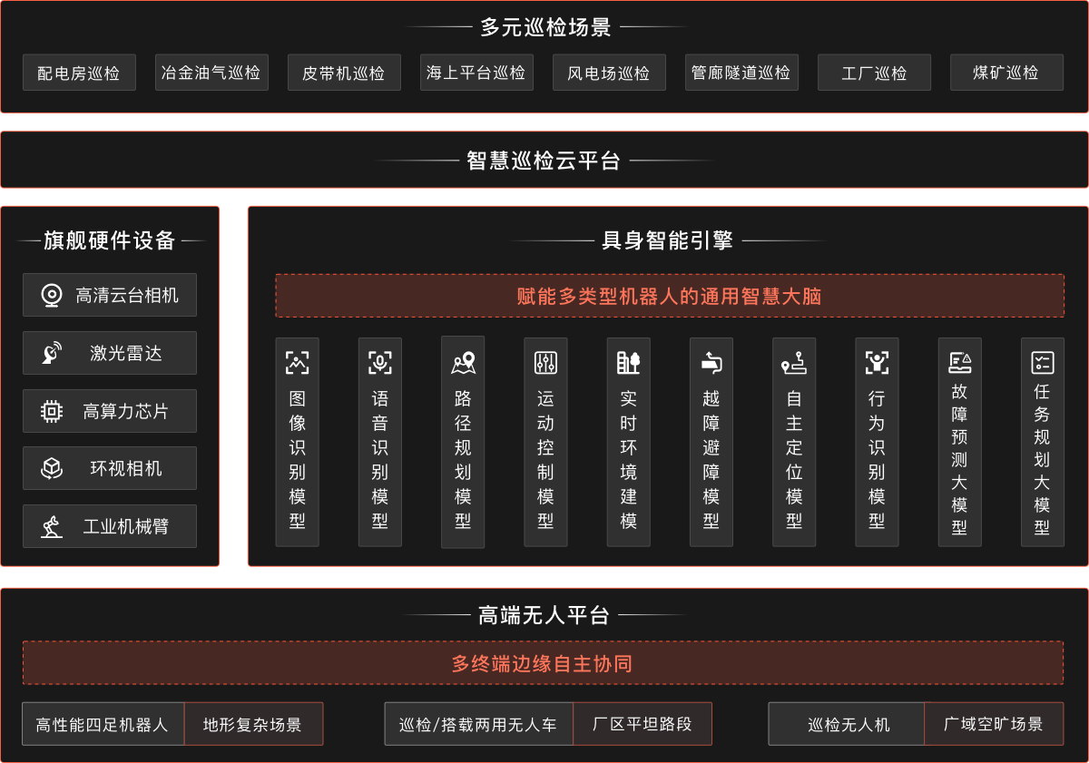 基于大语言模型的智能交互与规划技术,使巡检系统具备智能任务规划、 故障预测预警等能⼒。